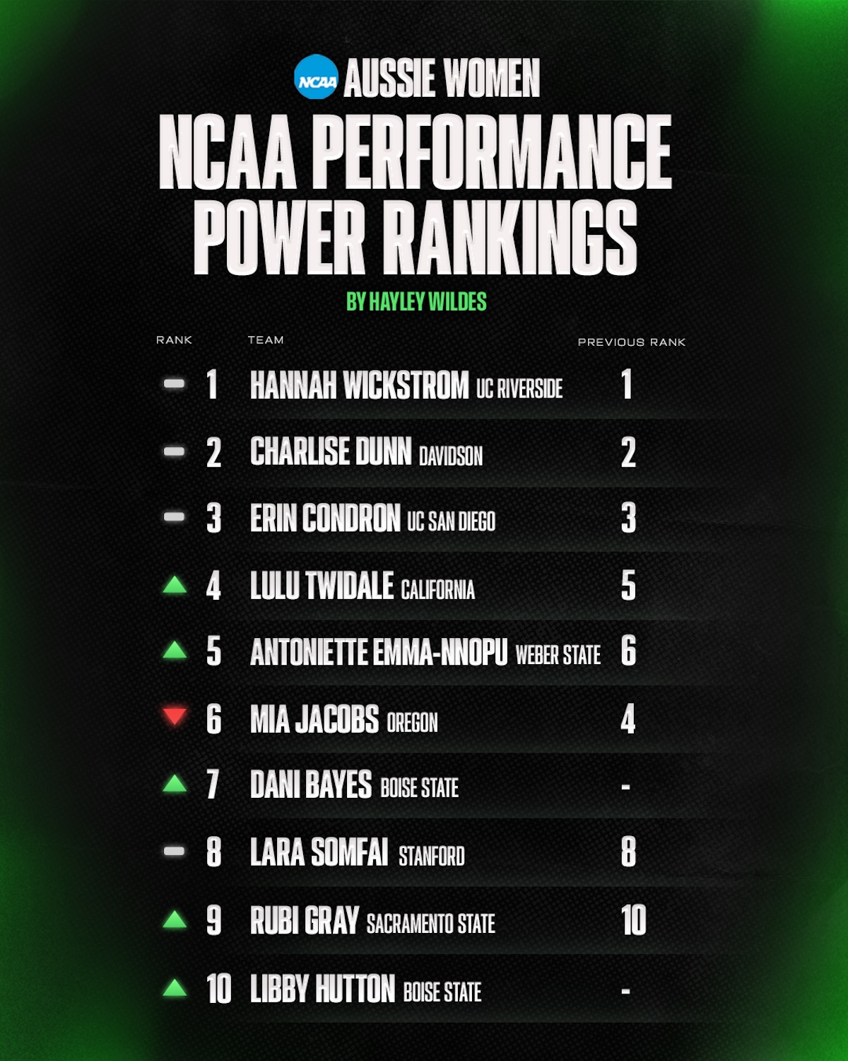 AUSTRALIAN NCAAW PLAYER POWER RANKINGS