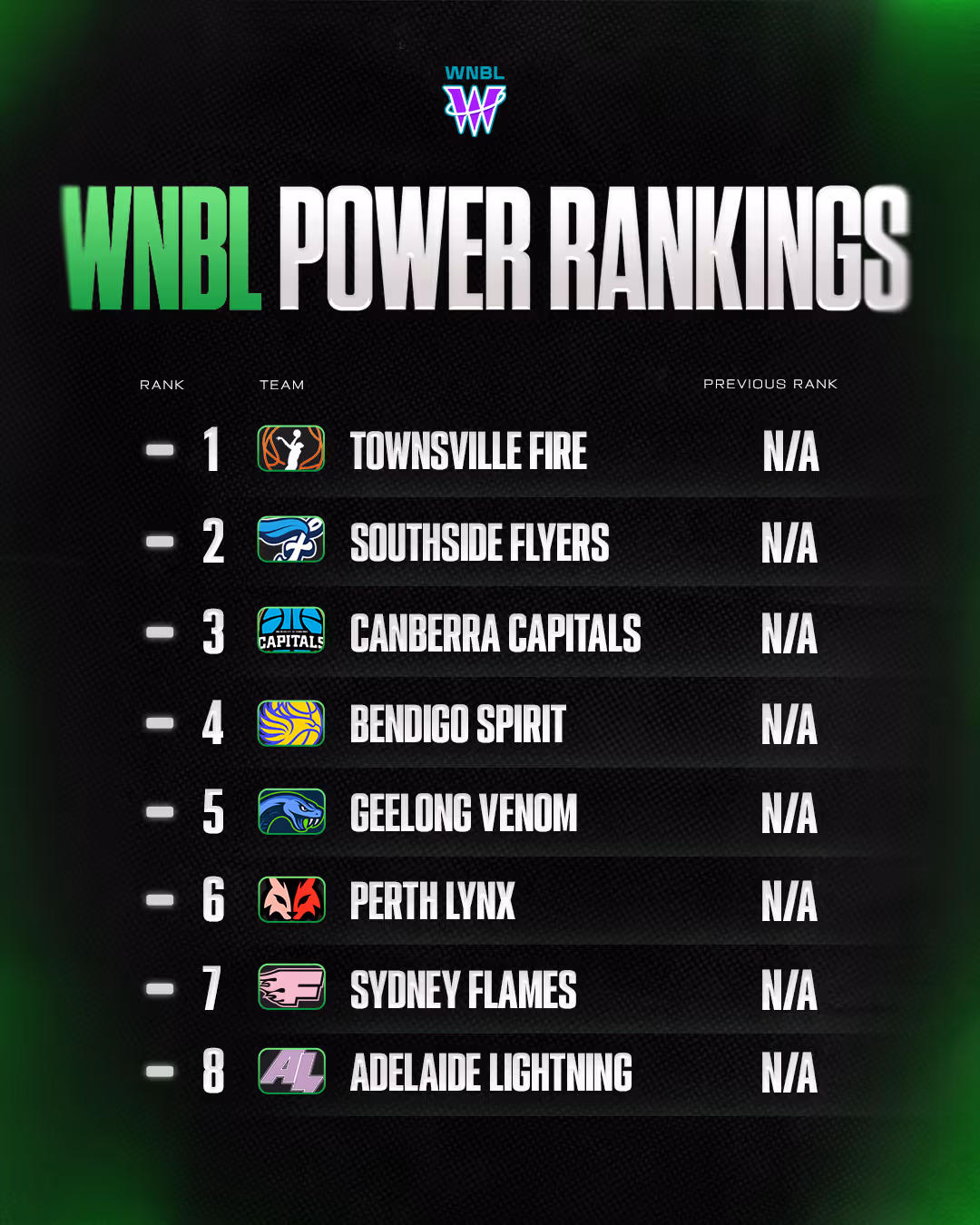 ➡️ 1. Townsville Fire ➡️ 2. Perth Lynx ➡️ 3. Bendigo Spirit ⬆️ 4. Canberra Capitals ↘️ 5. Southside Melbourne Flyers ↘️ 6. Adelaide Lightning ➡️ 7. Geelong Venom ⬇️ 8. Sydney Flames